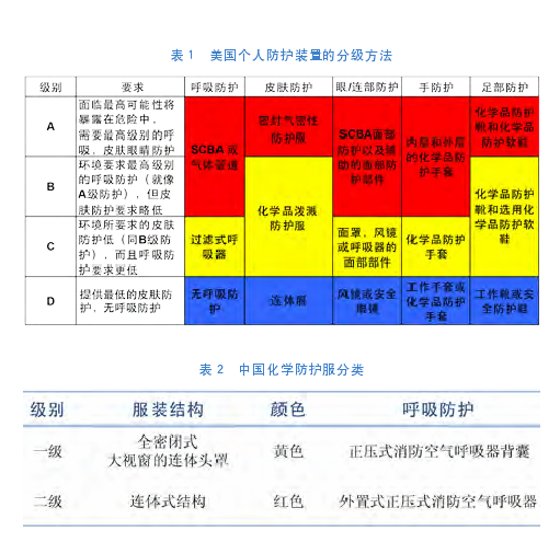 國內(nèi)標(biāo)準(zhǔn)GA 770-2008《 消防員化學(xué)防護(hù)服》中參考了USA的標(biāo)準(zhǔn),對(duì)化學(xué)防護(hù)服的分類標(biāo)準(zhǔn)進(jìn)行了簡(jiǎn)化,如表2所示。我國的一級(jí)防護(hù)裝備等同于USA的A級(jí)防護(hù),二級(jí)就是A級(jí)以下的防護(hù)裝備了。