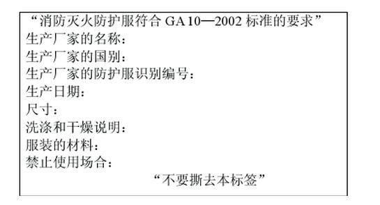 2、查看消防員滅火防護服是否有標簽,查看標簽內(nèi)容是否符合規(guī)定,每一件防護服應(yīng)有永久性的標簽,標簽應(yīng)放置在防護上衣前胸左側(cè)的舒適層上,標簽上應(yīng)提供圖中所規(guī)定的內(nèi)容。