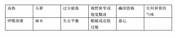 注意:穿著防化服時(shí),如果出現(xiàn)以下描述癥狀,請(qǐng)立即脫下防化服: