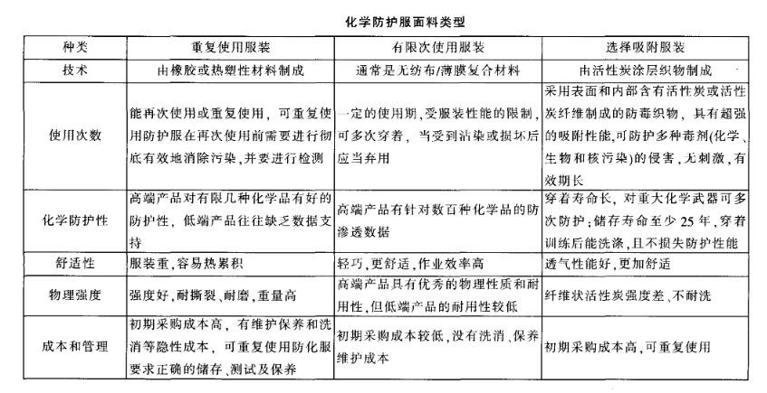 目前市場銷售的防護(hù)服主要存在有限次使用、重復(fù)使用、選擇吸附等三種類型防護(hù)服面料。