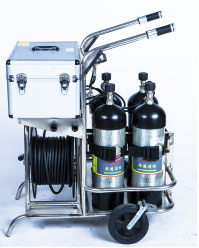 • 組成部件:長(zhǎng)管推車(chē)、長(zhǎng)管繞盤(pán)裝置、氣瓶、氣源分配器、減壓器、壓力顯示裝置、長(zhǎng)管、面罩、供氣閥、便攜式腰帶。