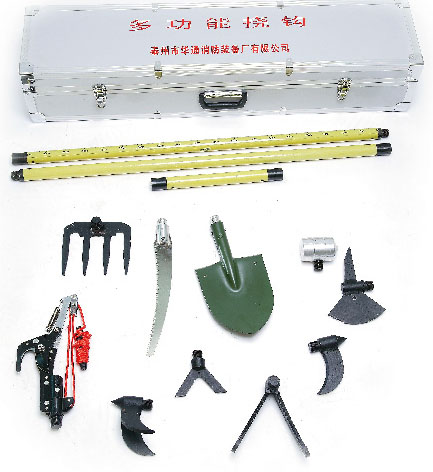 ·多功能撓鉤是在消防撓桿基礎上采用一桿多頭的形式,包括消防斧、木相映、爪耙、接桿(水平和標高測量尺、探路棒)撐頂器、消防鋸、消防剪等多種破拆救援工具。是消防部隊在火災撲救和搶險救援中常用的一種破拆類工具。
